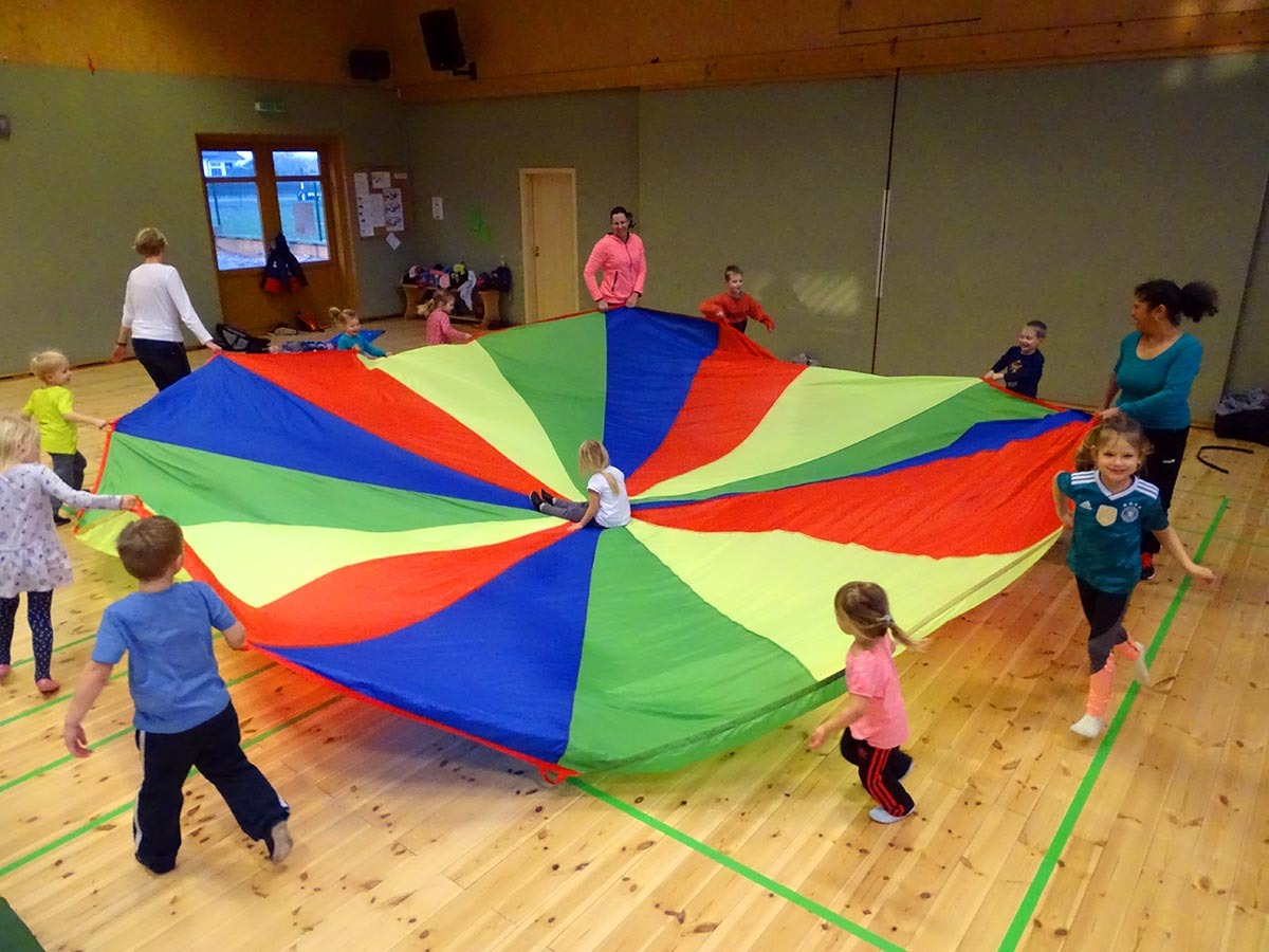 Die Stunde steht für interessante und anregungsreiche Geräteparcours und Spielelandschaften. Es kann gehüpft, balanciert, geklettert, gerutscht und vieles mehr ausprobiert werden.